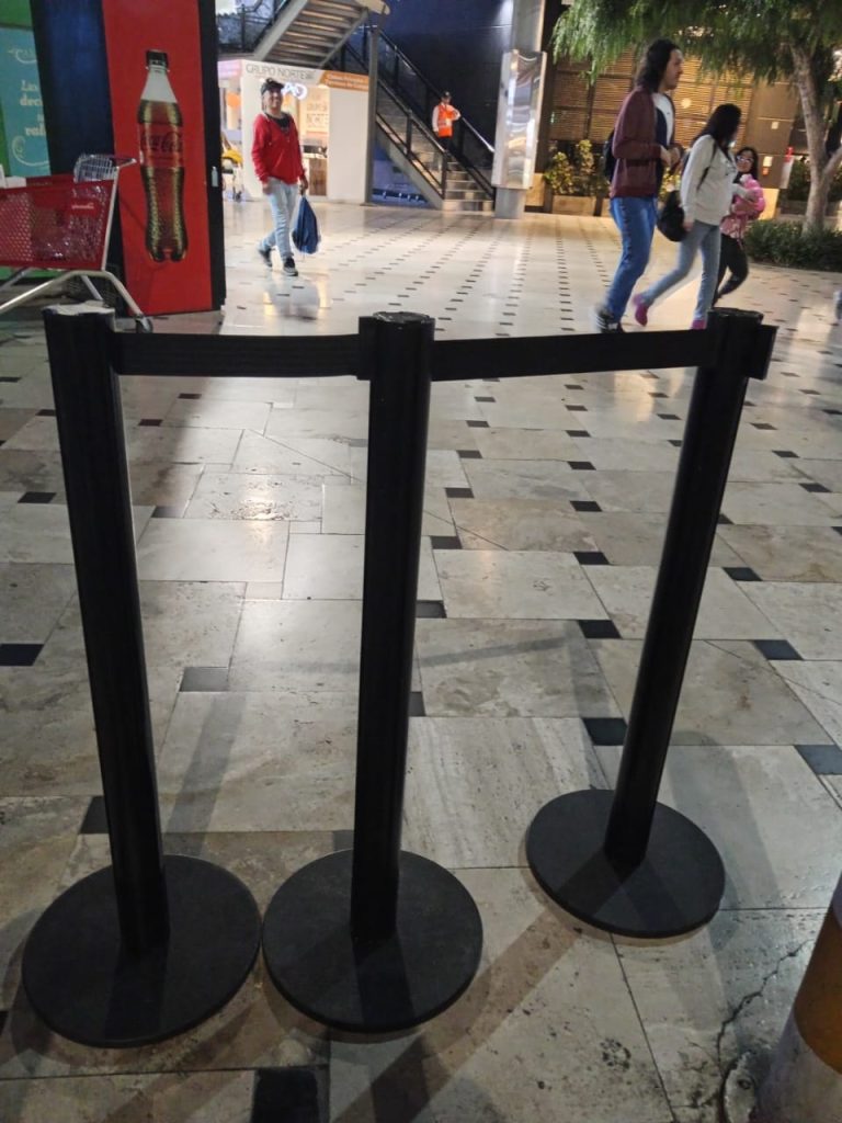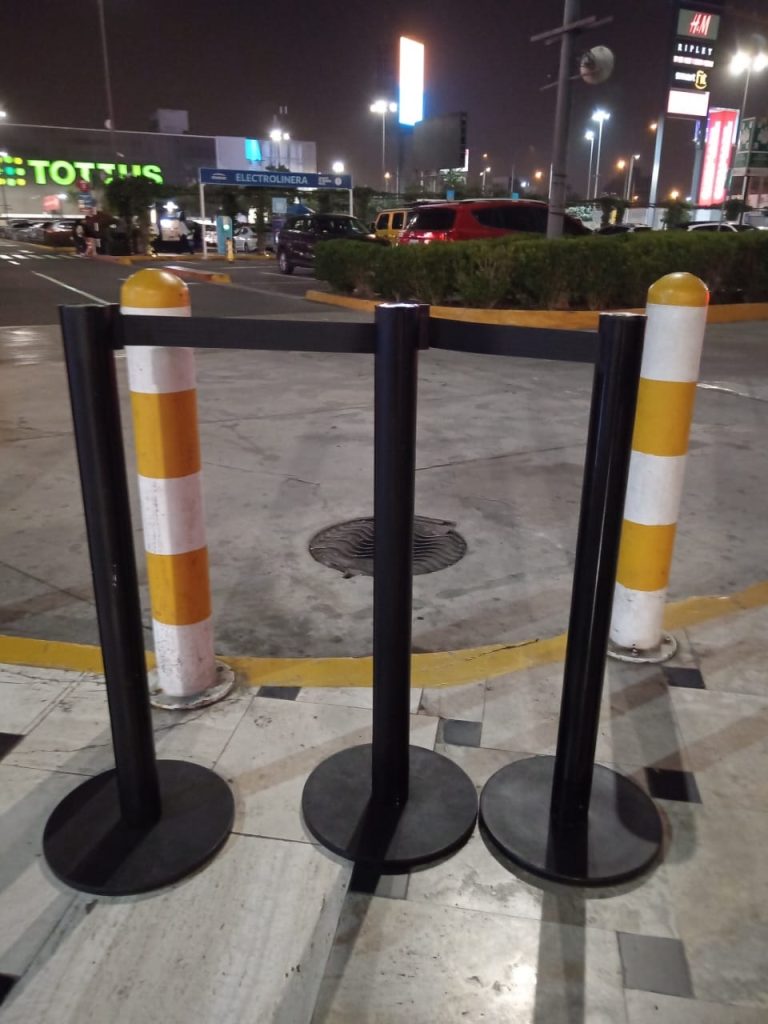 Poste con cinta retráctil : Tienen una cinta extensible que se extrae y se engancha a otro poste, permitiendo ajustar la longitud de la barrera. Son comunes en aeropuertos, bancos y tiendas.