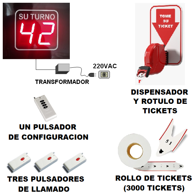 Sistema de Turno con Pantalla Electrónica de 2 Dígitos de Turno, 1 Dígito de Modulo, Dispensador de Tickets y Pulsadores Inalámbricos