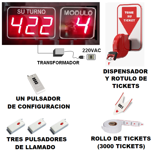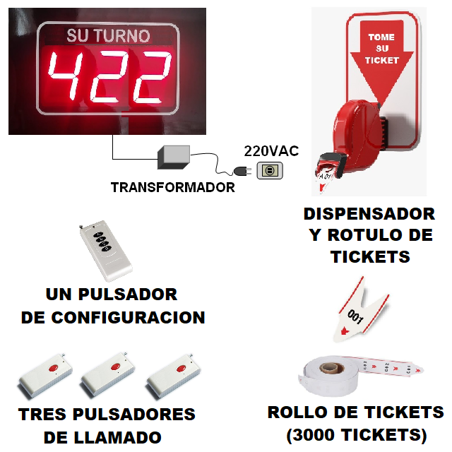 Sistema de Turno con Pantalla Electrónica de 3 Dígitos de Turno, 1 Dígito de Modulo, Dispensador de Tickets y Pulsadores Inalámbricos