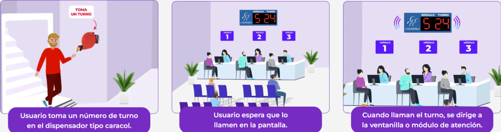 El cliente al llegar al local toma un ticket de atención del dispensador de tickets. Luego desde el punto de atención se observa personas esperando ser atendidas y con el pulsador inalámbrico se llama al cliente. Se utiliza la pantalla electrónica para mostrar el numero de ticket que se esta llamando..